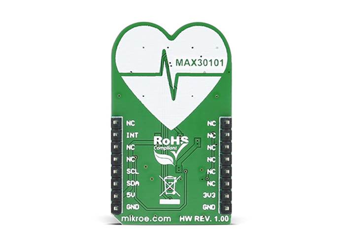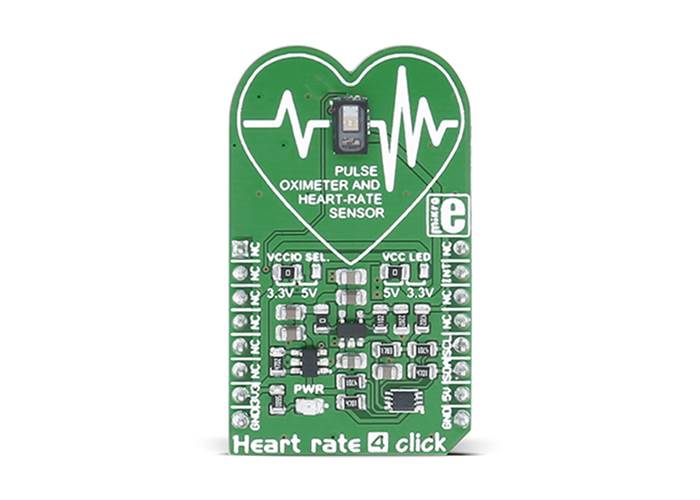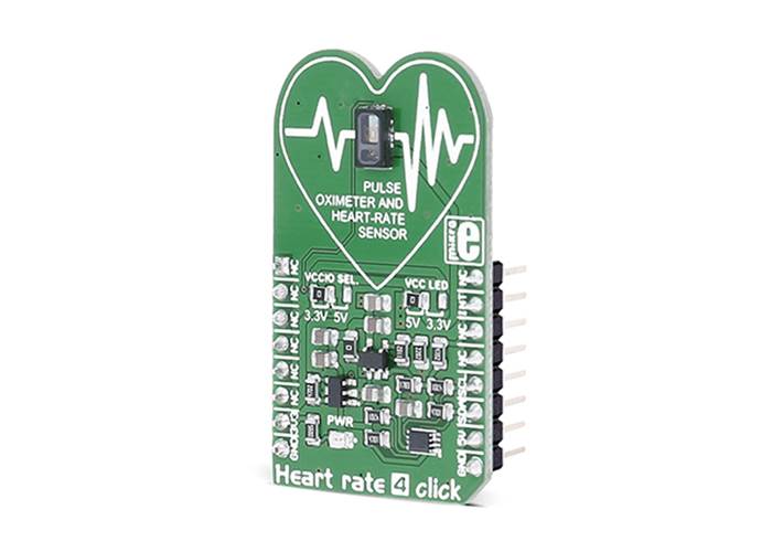 Heart Rate 4 Click carries the MAX30101 high-sensitivity pulse oximeter and heart-rate sensor from Analogue Devices. The Click is designed to run on either 3.3V or 5V power supply.