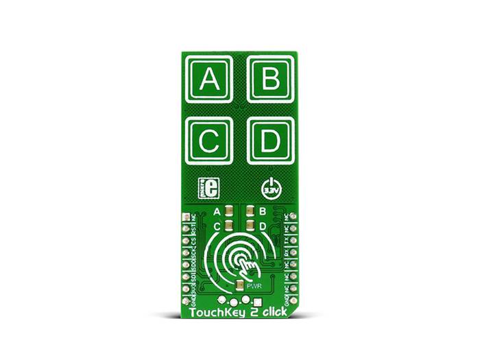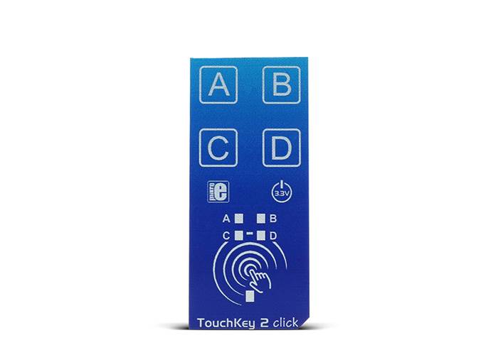 TouchKey 2 Click has four capacitive pads powered by Microchip's ATtiny817 which has an integrated touch QTouch® controller. The Click is designed to run on a 3.3V power supply. The four LEDs onboard the Click indicate when the Key (Pad) is pressed.