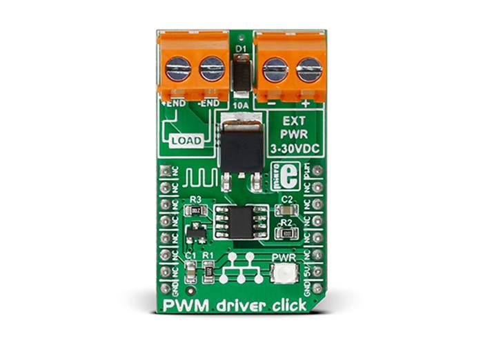 There are two pairs of screw terminals on the PWM Driver Click — one for the external power supply and one for the DC load.