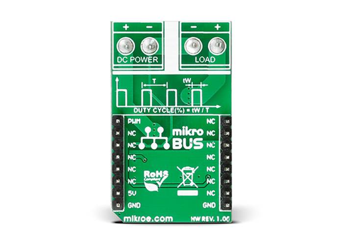 The Click contains a P-channel DMP3010LK3 MOSFET transistor. When the Click is used for PWM control it is not recommended to use it with loads of wattage over 50W because the MOSFET chip can get overheated; however, this does not apply when the Click is used as an ON/OFF switch.