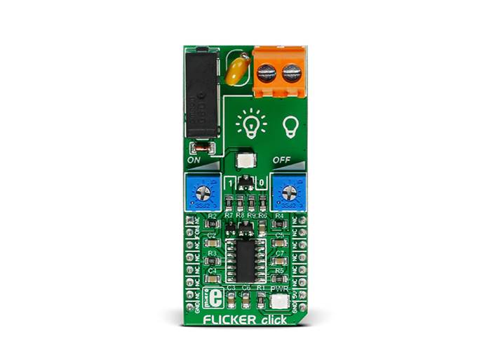 The on/off period can last from 0.1 to 6 seconds, that can be set by the two ON/OFF onboard potentiometers. The external load can be connected to the board through the screw terminal. FLICKER Click runs on 5V power supply and it communicates with the MCU over RST pin.