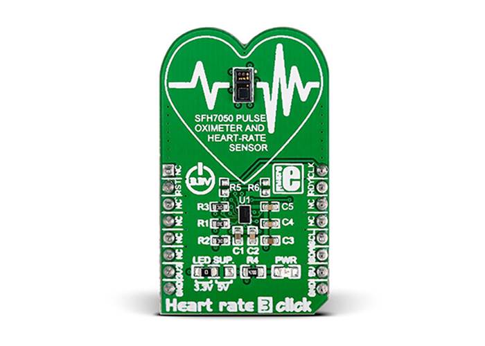 Heart Rate 3 Click is a mikroBUS add-on board whose functionality is determined by two components: an OSRAM’s SFH7050 pulse oximetry and heart rate monitoring module, and a TI AFE4404 (analong-front-end) IC specialised for bio-sensing.