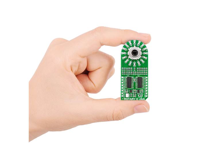 Rotary Click carries a 15-pulse incremental rotary encoder with detents, surrounded by a ring of 16 orange LEDs. It’s a perfect solution for adding a precision input knob to your design. The encoder outputs A and B signals (out of phase to each other); the knob also acts as a push-button which sends an interrupt to the target board MCU. The LED ring is controlled through SPI lines (CS, SCK, MISO, MOSI). Rotary Click can be used with either a 3.3V or 5V power supply.