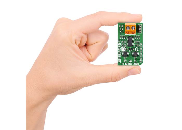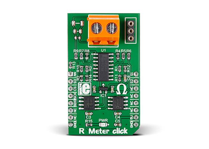 R Meter Click is a mikroBUS add-on board with circuitry for measuring the value of resistors. The board can be used to measure a wide range of resistors (from 0 to 1 Mega Ohm) The design is based on a non-inverting AD8616 amplifier circuit, with the measured resistor placed in a feedback loop that influences the gain of the amplifier.