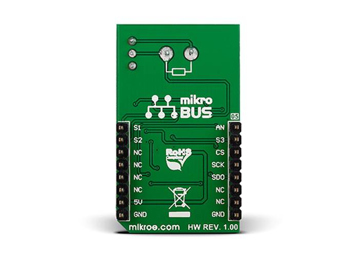 The supplied firmware (available on Libstock) automatically scans the ADC value and switches the multiplexer output based on the resistor in place. The multiplexer interfaces directly with the target board MCU through mikroBUS™ S1, S2, and S3 pins (in place of default mikroBUS™ PWM, INT and RST).