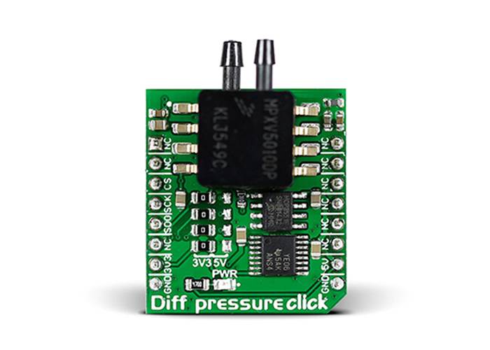 Diff Pressure Click carries NXP’s MPXV5010DP signal conditioned, temperature compensated and calibrated pressure sensor with two axial ports to accommodate industrial grade tubing. The Click is designed to run either on 3.3V or 5V power supply. It communicates with the target microcontroller over SPI interface (CS, SCK, MISO).