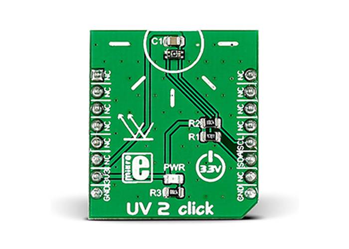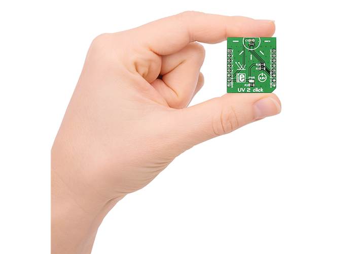 UV 2 Click is a mikroBUS™ add-on board with a VEML6075 UVA and UVB light sensor. VEML6075 is a CMOS chip that incorporates a photodiode, amplifiers, and analogue/digital circuits. With UV 2 Click, Solar ultraviolet light intensity is converted to 16-bit digital values.