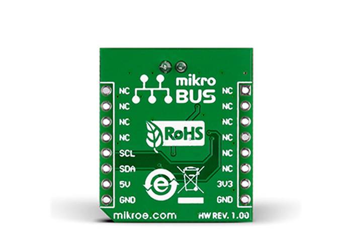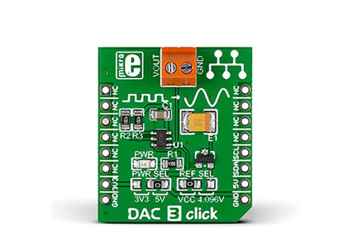 DAC3 Click carries Microchip’s MCP4726 IC, a 12-bit digital-to-analogue converter, along with voltage output screw terminals. The digital value is converted to the appropriate voltage level in the range between GND and REFERENCE (VCC or 4.096V), which is proportional to the received 12-bit number. MCP4726 also integrates EEPROM for storing DAC register and configuration bit values. The board communicates with the target board MCU through the mikroBUS I2C interface (SCL, SDA pins). Standard (100 kHz), fast (400 kHz) and highspeed (3.4 MHz) I2C modes are available. Uses either a 3.3V or a 5V power supply.