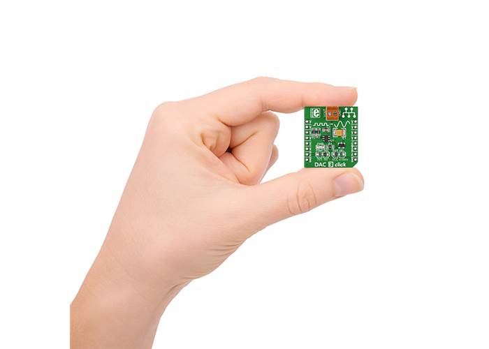 DAC3 Click carries Microchip’s MCP4726 IC, a 12-bit digital-to-analogue converter, along with voltage output screw terminals. The digital value is converted to the appropriate voltage level in the range between GND and REFERENCE (VCC or 4.096V), which is proportional to the received 12-bit number.