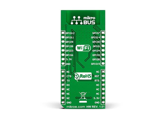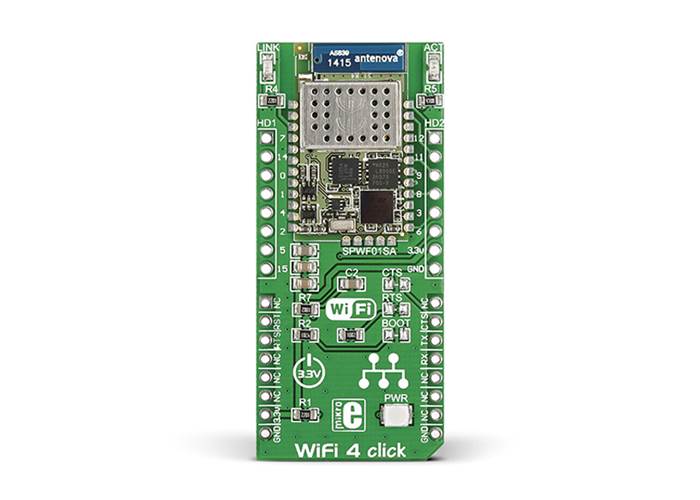 WiFi 4 Click carries SPWF01SA, a complete standalone WiFi module with a single-chip 802.11 b/g/n transceiver, a 32-bit STM32 MCU, along with a built-in 2.4 GHz ISM band antenna.