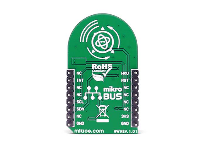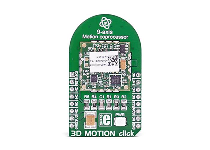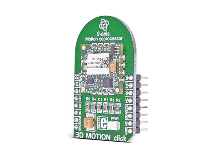 3D Motion Click carries Microchip’s MM7150 9-axis sensor fusion motion module. It’s a complete self contained solution comprising a 3-axis accelerometer, a gyroscope, a magnetometer, and a SSC7150 motion coprocessor.