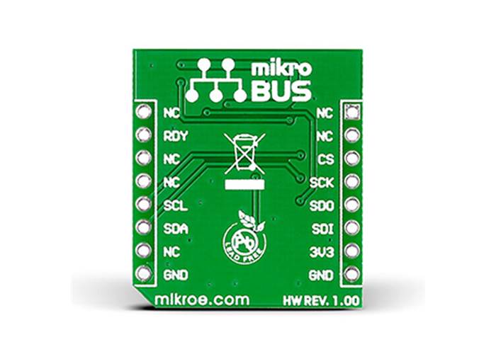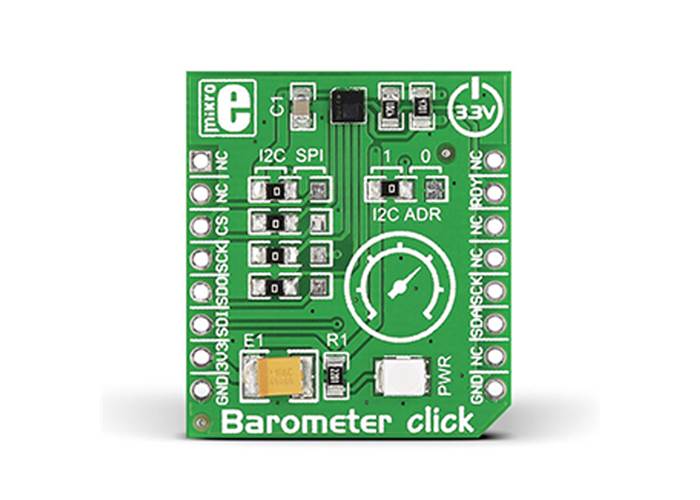 Barometer Click carries the LPS25HB IC, which is a piezoresistive absolute pressure sensor with a measurement range from 260 to 1260 hPa (with a 24-bit resolution output). It’s a high precision sensor: n high resolution mode it can measure pressure within 0.01 hPa RMS.