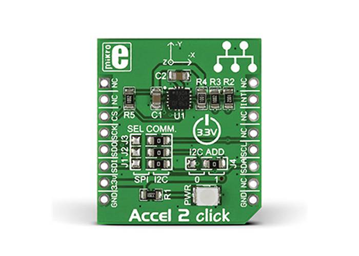 Accel 2 Click carries ST.’s LIS3DSH IC, a low-power factory-calibrated three-axis accelerometer which embeds a FIFO buffer and two programmable state machines. It allows you to implement gesture recognition. User-defined programs can distinguish movement patterns like shake and double shake, face up and face down, turn and double turn, and activate an interrupt upon their execution. You can also switch between I2C and SPI interfaces for communicating with the target board MCU (by soldering the onboard jumpers in the appropriate positions). Accel 2 Click is designed to use a 3.3V power supply only.