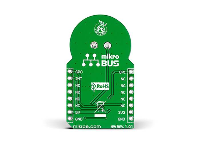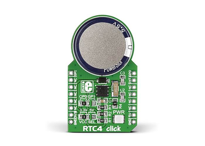 RTC4 Click carries DS2417, a real time clock/calendar with a 1-Wire MicroLAN interface and a programmable interrupt for system output. The clock frequency is derived from an onboard 32.768KHz oscillator. An integrated backup energy source maintains a charge with an onboard coin cell supercapacitor. The clock has an accuracy of +/-2 minutes per month at a 25 degrees Celsius temperature. Depending on the position of the onboard jumper, RTC4 Click communicates with the target board MCU either through mikroBUS AN or PWM pin (here, GPI01, GPIO0), plus the INT pin. The board is designed to use either a 3.3V or 5V power supply.