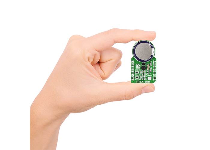 RTC4 Click carries DS2417, a real time clock/calendar with a 1-Wire MicroLAN interface and a programmable interrupt for system output. The clock frequency is derived from an onboard 32.768KHz oscillator. An integrated backup energy source maintains a charge with an onboard coin cell supercapacitor.