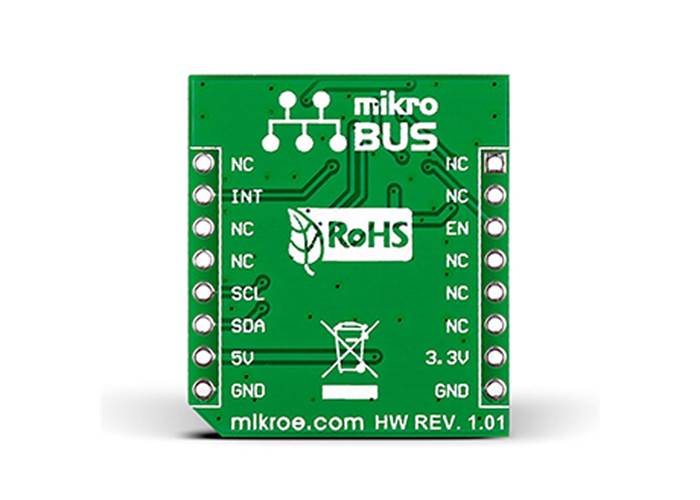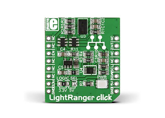 LightRanger Click is a proximity sensor carrying ST.’s VL6180X IC. This chip is based on ST.’s patented FlightSense technology: the sensor — consisting of an IR emitter, ambient light sensor, and range sensor — calculates distance by measuring the time it takes for a photon to travel to the nearest object and back (Time of Flight). In contrast to conventional IR proximity sensors which derive distance by measuring the amount of light reflected, VL618OX works with all objects, regardless of their colour or reflectivity. LightRanger Click communicates with the target board MCU through mikroBUS I2C pins (SCL, SDA), with additional interrupt (INT) and enable (EN, in place of default mikroBUS CS pin).