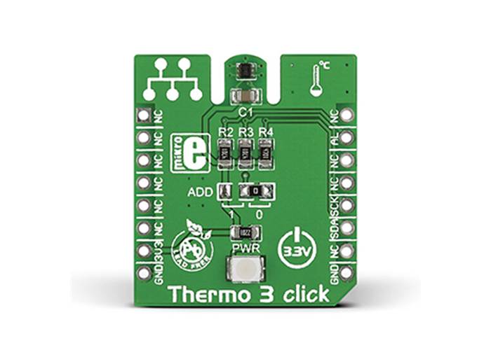 Thermo 3 Click carries TMP102, a digital temperature sensor IC with a tiny footprint of only 1.6mm x 1.6mm. The Click is designed to run on a 3.3V power supply only.