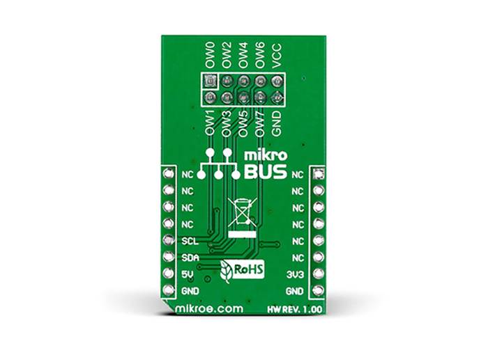 I2C 1-Wire Click carries DS2482-800, a “bridge device” that performs bidirectional conversions between I2C controller and 1-Wire peripheral devices. These can be EEPROM chips, temperature sensors and similar devices that have momentary high source current modes. I2C 1-Wire Click enables any host with I2C to generate properly timed 1-Wire waveforms to its peripheral devices. The I2C interface (mikroBUS SCL and SDA pins) supports both standard I2C (100kHz max) and fast (400kHz) communication speeds. In addition to the mikroBUS™ socket, I2C 1-Wire Click has an 8-channel pinout (each pin an independently operated 1-Wire I/O). The board is designed to use either a 3.3V or 5V power supply.