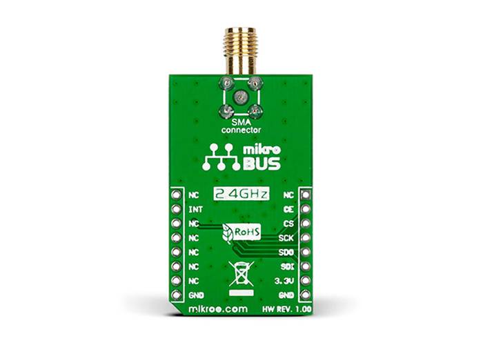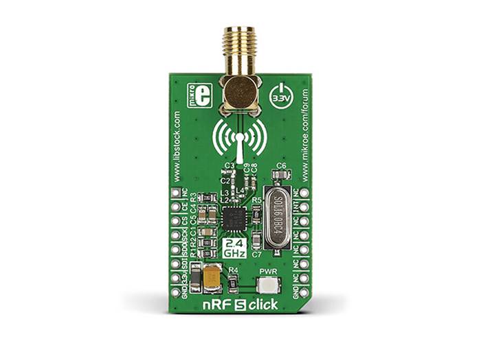 nRF S Click is a compact and easy solution for adding a 2.4 GHz transceiver to your design. It features nRF24L01P 2.4 GHz transceiver module with an embedded baseband protocol engine as well as an SMA antenna connector (antenna sold separately).