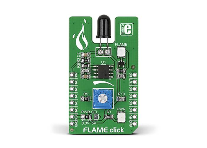 Flame Click is a fire detection solution. It carries a PT334-6B silicon phototransistor that’s covered in black epoxy and therefore sensitive only to infrared light. To use it as a fire alarm, set up the exact detection threshold through the onboard potentiometer (once reached, the Click will send an interrupt to the target board MCU through the mikroBUS INT pin). Othewise the sensor can also output a continuous analogue signal through the mikroBUS™ AN pin. Flame Click can use both a 3.3V or a 5V power supply.