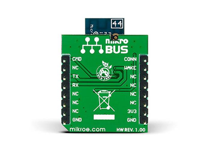 BLE 2 Click features the RN4020 module from Microchip, that integrates RF, a baseband controller, and a command API processor, making it a complete Bluetooth Low Energy solution. The Click communicates with the target board MCU through mikroBUS™ RX, TX and AN (CMD), PWM (con.), and RST (wake) lines. The board is designed to use 3.3V power supply only.