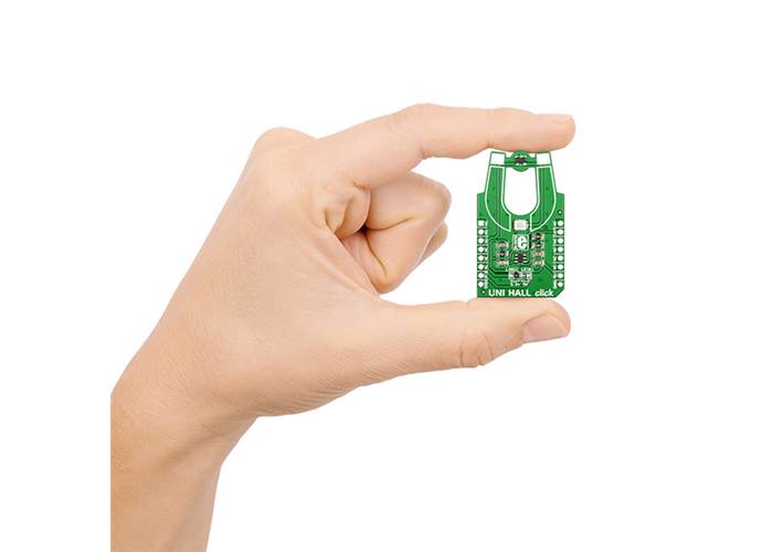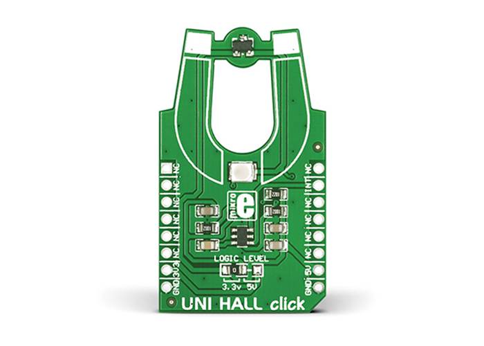 UNI HALL Click is a simple solution for adding an unipolar Hall switch to your design. It carries the Melexis US5881 unipolar Hall-effect switch and a 74LVC1T45 single bit, dual supply translating transceiver.