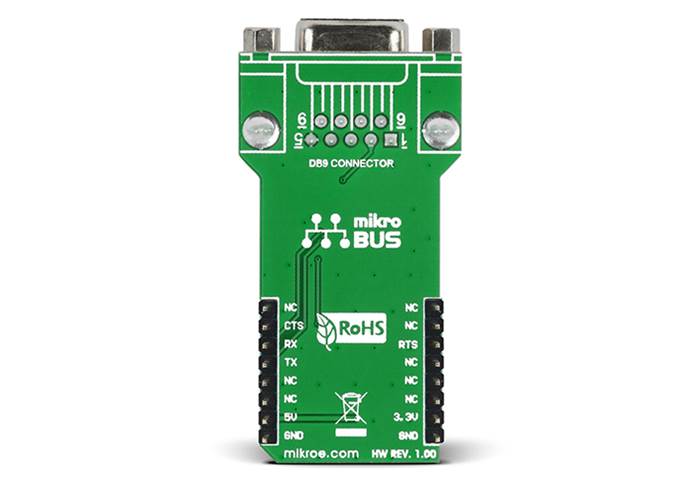 The Click board™ comes equipped with the SUB D connector, typically found on many devices that use the RS-232 interface. This connector can be used to connect the Click board™ directly to the RS-232 bus, offering RX, TX, CTS and RTS RS-232 signals.
