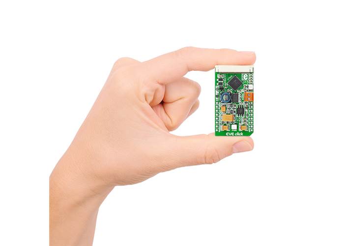 EVE Click is a display controller board in mikroBUS™ form factor. It features state-of-the-art FT800Q graphics controller which integrates display, audio and touch onto a low cost, easy-to-use, single-chip solution.