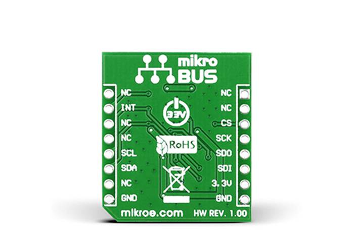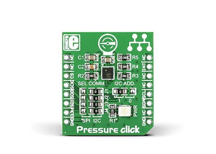 Pressure Click is a compact and easy solution for adding pressure measurement to your design. It features LPS331AP digital output pressure sensor. LPS331AP IC is an ultra compact absolute piezoresistive pressure sensor capable to measure pressure (260-1260 mbar) or temperature (-40°C to 80°C) and provide a digital signal to main board microcontroller. Pressure Click communicates with the target board microcontroller via mikroBUS™ SPI (MOSI, MISO, SCK, CS), I2C (SDA, SCL) and INT lines. The board is designed to use 3.3V power supply only.