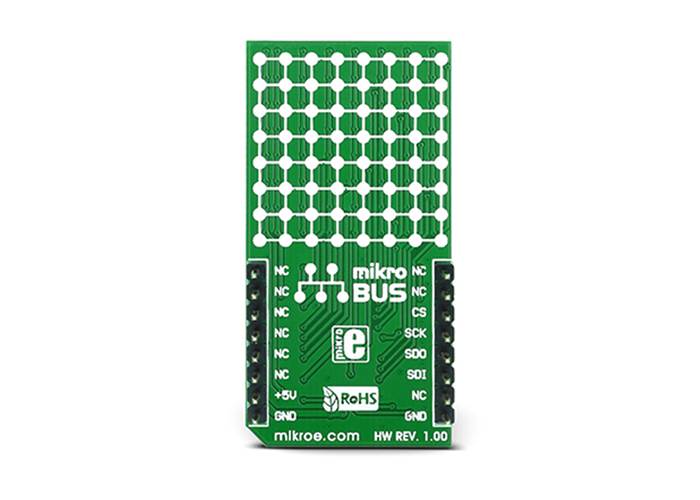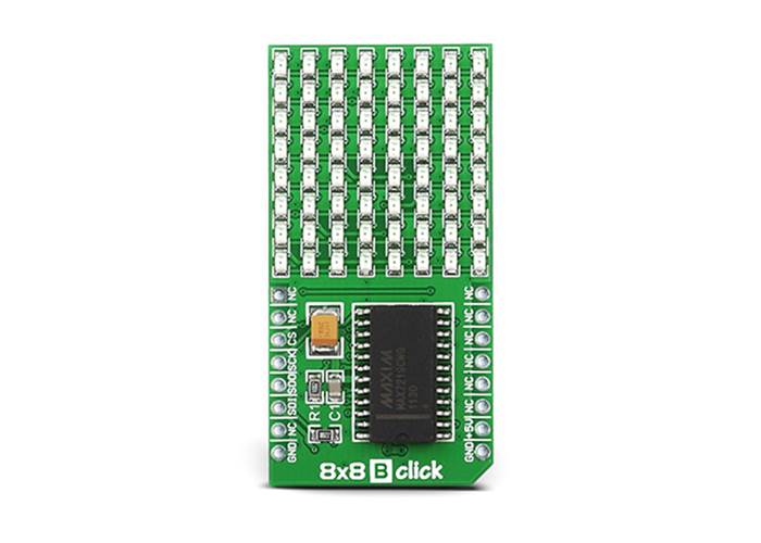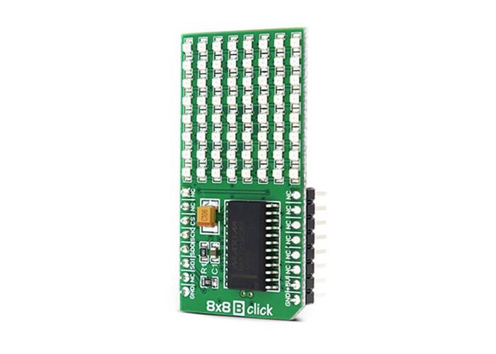 8x8 B Click is a 64 LED matrix display Click board™, composed of SMD LEDs organised in 8 rows by 8 columns.