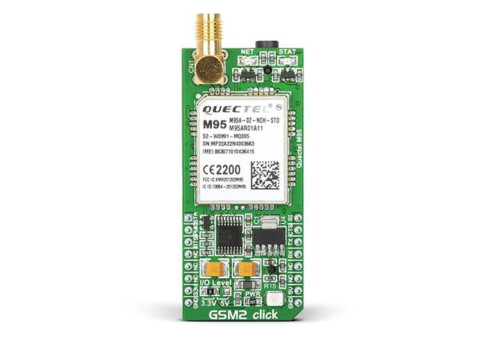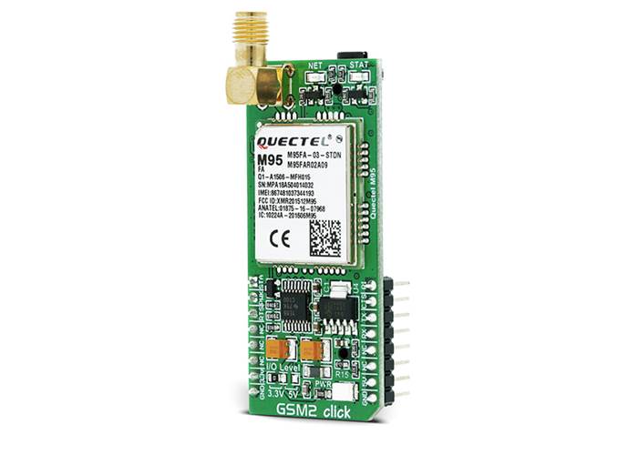 GSM 2 Click is a compact quad-band GSM cellular network communication solution, featuring the GSM/GPRS Quectel M95. This module features a full set of options for the cellular networking and communication, such as the network status indication, jamming detection, embedded internet protocols, including TCP/IP, UDP, FTP, PPP, HTTP, SMTP, full GPRS multislot class 12 implementation, it is fully compliant to GSM Phase 2/2+, and more. Data communication speed is rated up to 85.6 kbps for both uplink and downlink connection. This module offers high quality integrated audio interface, allowing voice communication over the onboard 3.5mm headset connector.