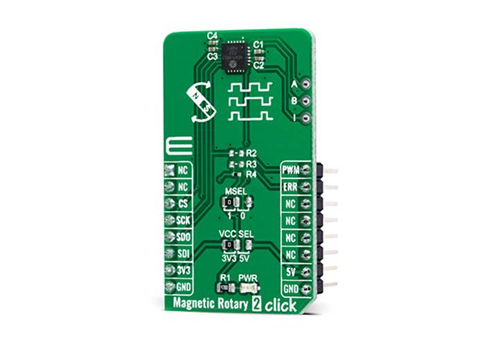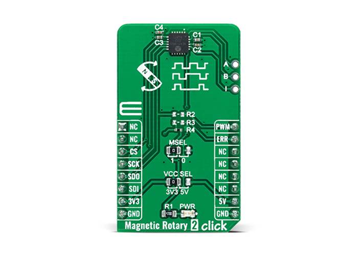 Magnetic Rotary 2 Click communicates with MCU through a standard SPI interface supporting the common SPI mode, SPI Mode 1. Digital processing provides a digitised output of the absolute and incremental signals. Each output is configurable via CS pin, MSEL (Mode Selection for desirable protocol) jumper, and AEAT-9922 internal PSEL registers configurable through memory. In addition, an absolute angular representation also can be selected using a pulse width modulated (PWM) signal by populating onboard R2 resistor, which provides an instant indication of the magnet's angular position with a selectable and one-time programmable resolution from 10 to 18 bits. Alongside this feature, the communication error signal labelled as ERR and routed on the INT pin of the mikroBUS™ socket can be activated by populating the onboard R3 resistor.