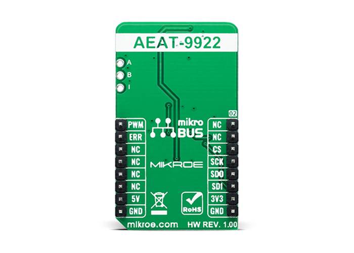 Magnetic Rotary 2 Click is a compact add-on board used for accurate magnet-position sensing. This board features the AEAT-9922, an angular magnetic rotary sensor providing accurate angular measurement over a full 360 degrees of rotation from Broadcom Limited. The AEAT-9922 uses integrated Hall sensor elements with complex analogue and digital signal processing within a single device. The absolute angle measurement provides an instant indication of the magnet's angular position with a selectable and one-time programmable resolution from 10 to 18 bits. It also comes with an onboard header reserved for incremental outputs of their respective A, B, and I pins, the same as the commutation U, V, and W signals. This Click board™ represents a versatile solution capable of supporting a broad range of applications with its robust architecture to measure and deliver absolute and incremental signals.