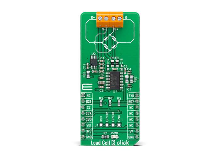 Load Cell 6 Click as its foundation uses the MAX11270, a pin programmable, ultra-low power 24-bit ΣΔ ADC that resolves a very high dynamic range from Analogue Devices. The MAX11270 achieves excellent 130dB SNR while dissipating an ultra-low 10mW. It allows users to select a programmable gain amplifier with gain settings between 1x to 128x, unity-gain buffer, or connect signals directly to the delta-sigma sampling network. This ADC can resolve micro-volt level changes to the analogue input, making it a good fit for seismic, instrumentation, and ATE applications.