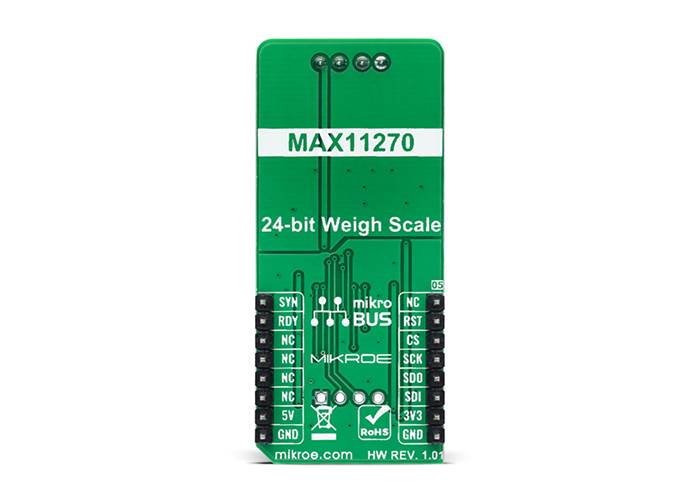 Load Cell 6 Click is a compact add-on board representing a weigh scale solution. This board features the MAX11270, a high-performance 24-bit delta-sigma ADC that achieves excellent 130dB SNR while dissipating an ultra-low 10mW from Analogue Devices. This SPI-configurable ADC sample rates up to 64ksps allow precision DC and AC measurements, with integral non-linearity guaranteed to 4ppm maximum. The MAX11270 offers a 6.5nV/√Hz noise programmable gain amplifier with gain settings between 1x to 128x. Optional buffers are also included to isolate the signal inputs from the switched capacitor sampling network, which allows the MAX11270 to be used with high-impedance sources without compromising the available dynamic range. This Click board™ is suitable for weight scale applications in various use cases.