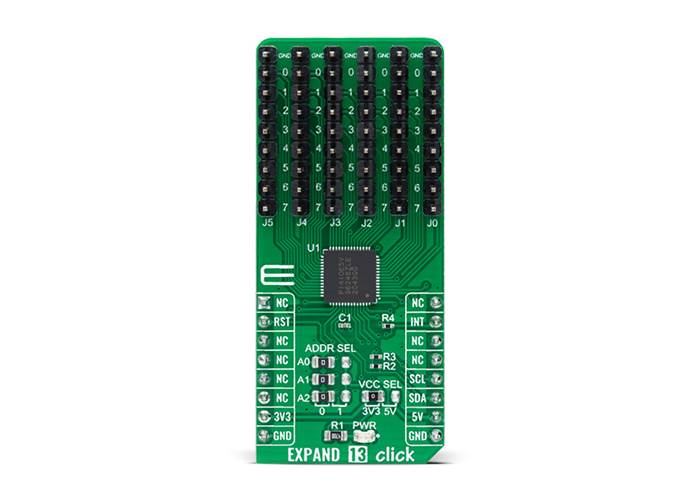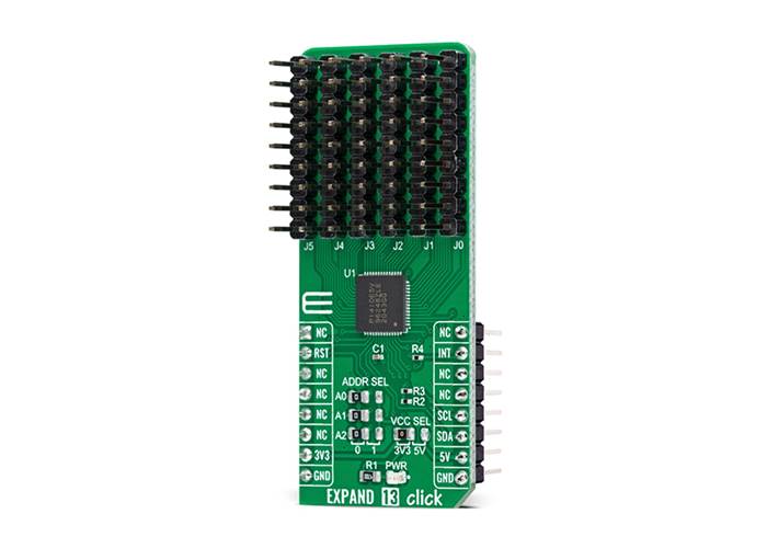 Expand 13 Click as its foundation uses the PI4IOE5V96248, a 48-bit low-voltage translating general-purpose remote I/O expander from Diodes Incorporated. This port expander is a simple solution when additional I/Os are needed while keeping interconnections to a minimum, particularly great for system monitoring applications, industrial controllers, portable equipment, and others. The PI4IOE5V96248 comes in a 6-channel configuration and has a built-in level shifting feature that makes it highly flexible in power supply systems where communication between incompatible I/O voltages is required.
