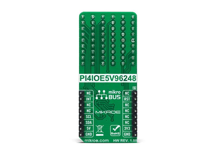 The Reset pin, routed to the RST pin of the mikroBUS™ socket, is used to place the PI4IOE5V96248 registers in their default state, while the interrupt, routed to the INT pin of the mikroBUS™ socket, may be configured as an interrupt to notify the host MCU of incoming data on any port without having to communicate via the I2C-bus.