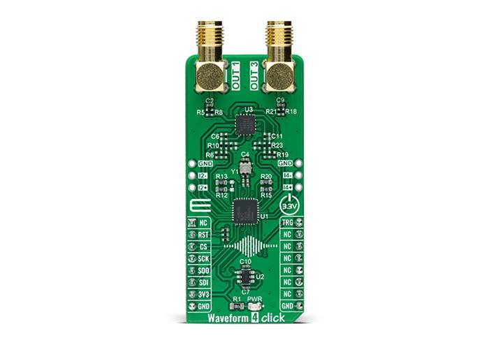 Waveform 4 Click is a compact add-on board that represents a high-performance signal generator. This board features the AD9106, a quad-channel, 12-bit, 180MSPS waveform generator, integrating on-chip static random access memory (SRAM) and direct digital synthesis (DDS) for complex waveform generation from Analogue Devices. The DDS is up to a 180 MHz main clock sinewave generator with a 24-bit tuning word allowing 10.8 Hz/LSB frequency resolution. It has a single frequency output and independent programmable phase shift outputs for each of the four integrated DACs. Besides, the integrated SRAM data can include directly generated stored waveforms, accessed using the serial peripheral interface, amplitude modulation patterns applied to DDS outputs, or DDS frequency tuning words. This Click board™ generates the high-speed, high-dynamic-range, multichannel complex waveforms required in applications such as ultrasound transducer excitation, medical instrumentation, portable instrumentation, signal generators, and arbitrary waveform generators.