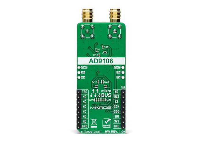 This Click board™ communicates with MCU through a standard SPI interface to program the internal registers for complete control of the AD9106. Besides, it possesses additional functionality such as a reset function implemented and routed at the RST pin of the mikroBUS™ socket, which resets all registers of the AD9106 to its default state.
