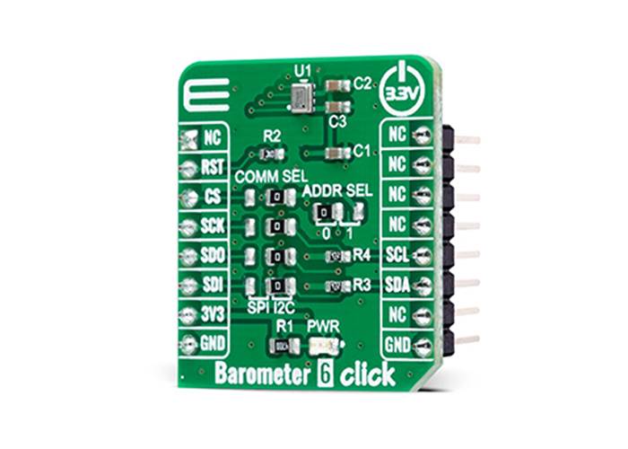 Barometer 6 Click is a compact add-on board used to measure air pressure in a specific environment. This board features the 2SMPB-02E, a high-accuracy digital barometric air pressure sensor with low current consumption from Omron Electronics. The 2SMPB-02E has a calibration parameter for broader pressure and temperature range, features a MEMS chip for sensing air pressure and an IC chip for signal processing. It converts pressure into a 24-bit digital value and sends the information via a configurable host interface that supports SPI and I2C serial communications. It measures pressure from 30kPa up to 110kPa with an accuracy of ±50Pa over a wide operating temperature range. This Click board™ is suited for various pressure-based applications, industrial, consumer, weather stations, and many more.