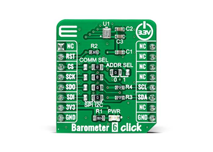 Barometer 6 Click as its foundation uses the 2SMPB-02E, a high-accuracy digital barometric air pressure sensor from Omron Electronics, to measure air pressure in a specific environment. The sensor has a calibration parameter for broader pressure and temperature range. It measures pressure from 30kPa up to 110kPa with an accuracy of ±50Pa over a wide operating temperature range, ideally suited to the harsh environmental conditions prevalent in industrial and consumer applications.