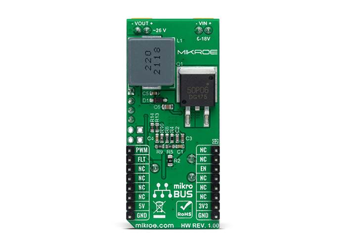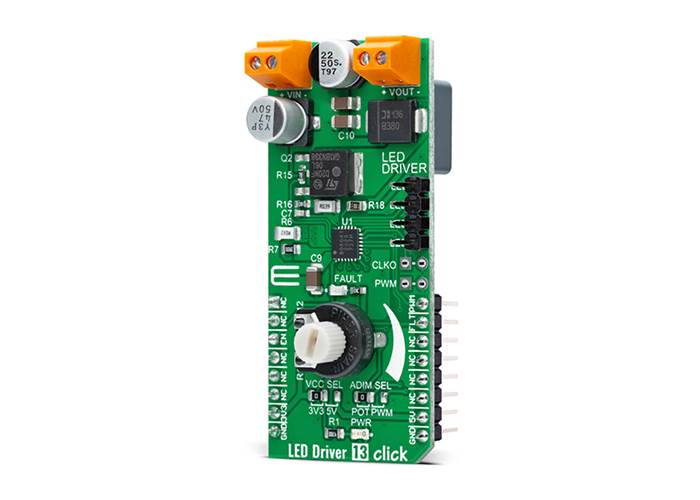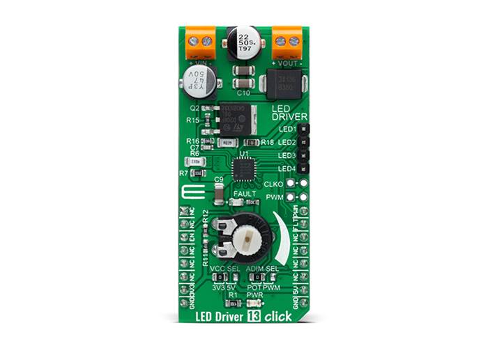 LED Driver 13 Click is a compact add-on board that simplifies the control of multiple LEDs. This board features the A80604-1, a 4-channel LED driver designed at a switching frequency of 400kHz that provides 150mA per channel from Allegro Microsystems. It is powered by an external power supply in the range of 6V to 18V, providing an output voltage of approximately 26V, which is used to power LEDs connected to LED channels. On the logical side, this board uses both 3V3 and 5V with mikroBUS™ power rails and communicates with the MCU via GPIO pins. In addition, the user is given the option of analogue or digital LED dimming selection, using a PWM pin from the mikroBUS™ socket or via an onboard potentiometer/external PWM signal. This Click board™ is suitable for various automotive applications, such as infotainment backlighting, interior/exterior lighting, heads-up display, and more.