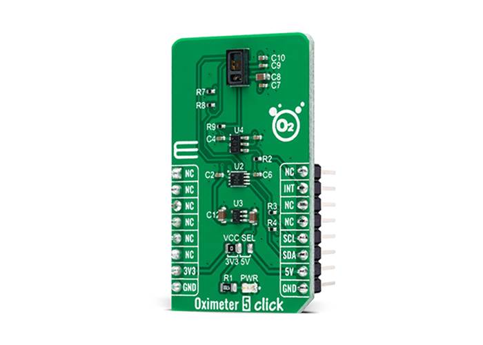 Oximeter 5 Click is a compact add-on board suitable for measuring blood oxygen saturation. This board features the MAX30102, integrated pulse oximetry, and heart-rate monitor module from Analogue Devices.