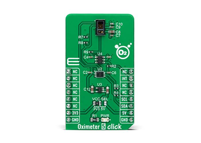Oximeter 5 Click is a compact add-on board suitable for measuring blood oxygen saturation. This board features the MAX30102, integrated pulse oximetry, and heart-rate monitor module from Analogue Devices. The MAX30102 includes internal LEDs, photodetectors, optical elements, and low-noise electronics with ambient light rejection. It operates on a single 1.8V power supply acquired from both mikroBUS™ power rails for the internal LEDs, communicating through a standard I2C compatible interface. The MAX30102 can be shut down through software with zero standby current, allowing the power rails to remain powered at all times. This Click board™ makes it an excellent choice for optical pulse oximetry and health monitoring applications.