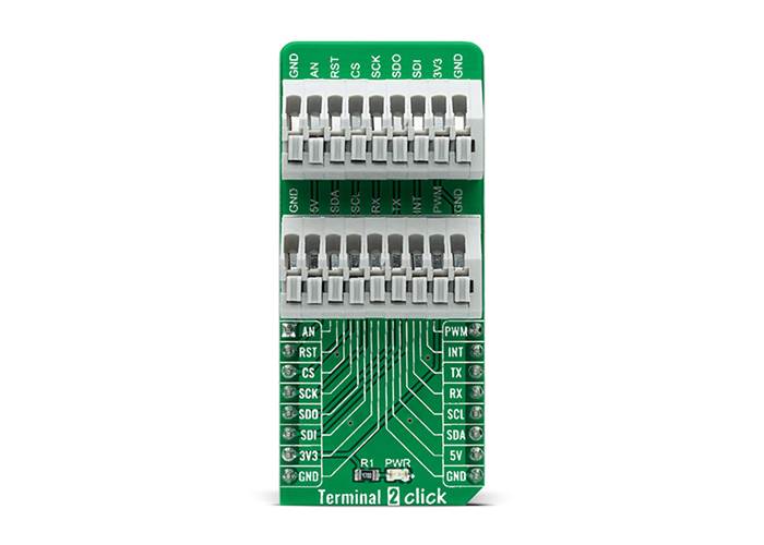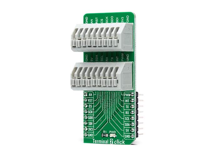 Terminal 2 Click is an adaptor Click board™ used as a mikroBUS™ socket expansion board. It provides an easy and elegant solution for adding the external connection capability to the Click board™, plugged on a mikroBUS™ socket. Featuring two 9-position 2.54mm pitch terminal blocks makes it an easy way to expand the development system's connectivity with the mikroBUS™ socket while keeping the bus free to use with any Click board™.