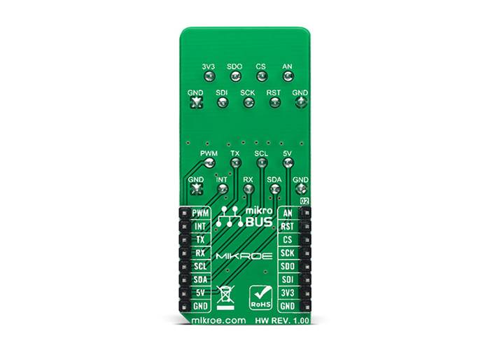 This Click board™ can operate with both 3.3V and 5V logic voltage levels. This way, it is allowed for both 3.3V and 5V capable MCUs to use the communication lines properly. A green LED visually detects the presence of an active power supply, labelled as PWR. However, the Click board™ comes equipped with a library containing easy-to-use functions and an example code that can be used, as a reference, for further development.