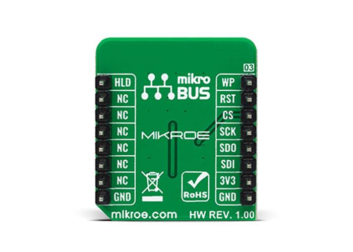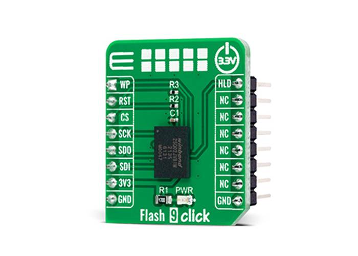 An additional feature of this Click board™ represents the configurable Write Protection function labelled as WP routed on the AN pin of the mikroBUS™ socket. The WP pin protects the entire memory and all registers from write operations and must be set to a low logic state to inhibit all the write operations. Besides, the Flash 9 Click also has an additional hold pin, labelled as HLD and routed to the PWM pin of the mikroBUS™ socket, allowing the device to be paused while it’s still actively selected.