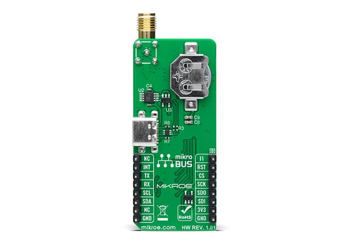 It is also equipped with a USB type C connector for a USB version 2.0 FS (Full Speed, 12 Mbit/s) compatible interface, available for communication as an alternative to the UART. With the help of the active USB voltage, the necessary power supply of the USB power block of the NEO-M8J is provided via the ADP1715 linear regulator. In the case of the primary supply failure, the module can use a backup supply voltage from a connected battery if you need the Click board™ to be a standalone device. Backup voltage supplies the real-time clock and battery-backed RAM and enables all relevant data to be saved in the backup RAM to allow a hot or warm start later.
