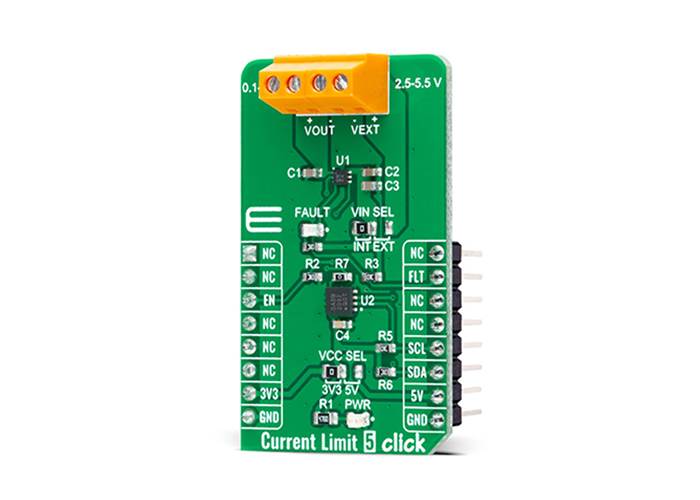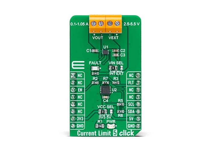 Current Limit 5 Click as its foundation uses the MIC2099, a current-limiting device with an adjustable overcurrent protection feature from Microchip Technology. The MIC2099 offers flexible protection boundaries for systems against input voltage ranging from 2.5V to 5.5V and limits the output load current to a programmed level (up to 1.05A). Additional safety features include thermal shutdown protection to prevent overheating, under-voltage lock-out, a soft start that prevents large current inrush, as well as automatic-on output after a fault condition.