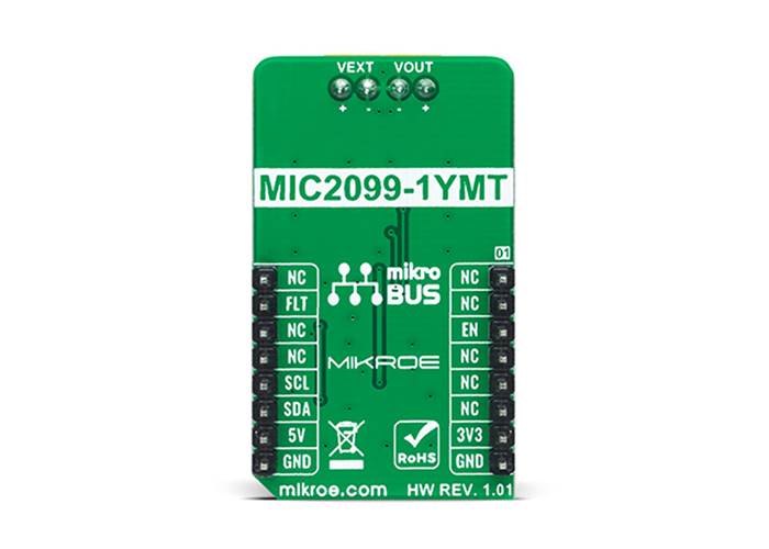 This Click board™ can operate with both 3.3V and 5V logic voltage levels selected via the VCC SEL jumper. It allows for both 3.3V and 5V capable MCUs to use the communication lines properly. Additionally, there is a possibility for the MIC2099 power supply selection via jumper labelled as VIN SEL to supply the MIC2099 from an external power supply VEXT terminal in the range from 2.5V to 5.5V or with VCC voltage levels from mikroBUS™ power rails. However, the Click board™ comes equipped with a library containing easy-to-use functions and an example code that can be used, as a reference, for further development.